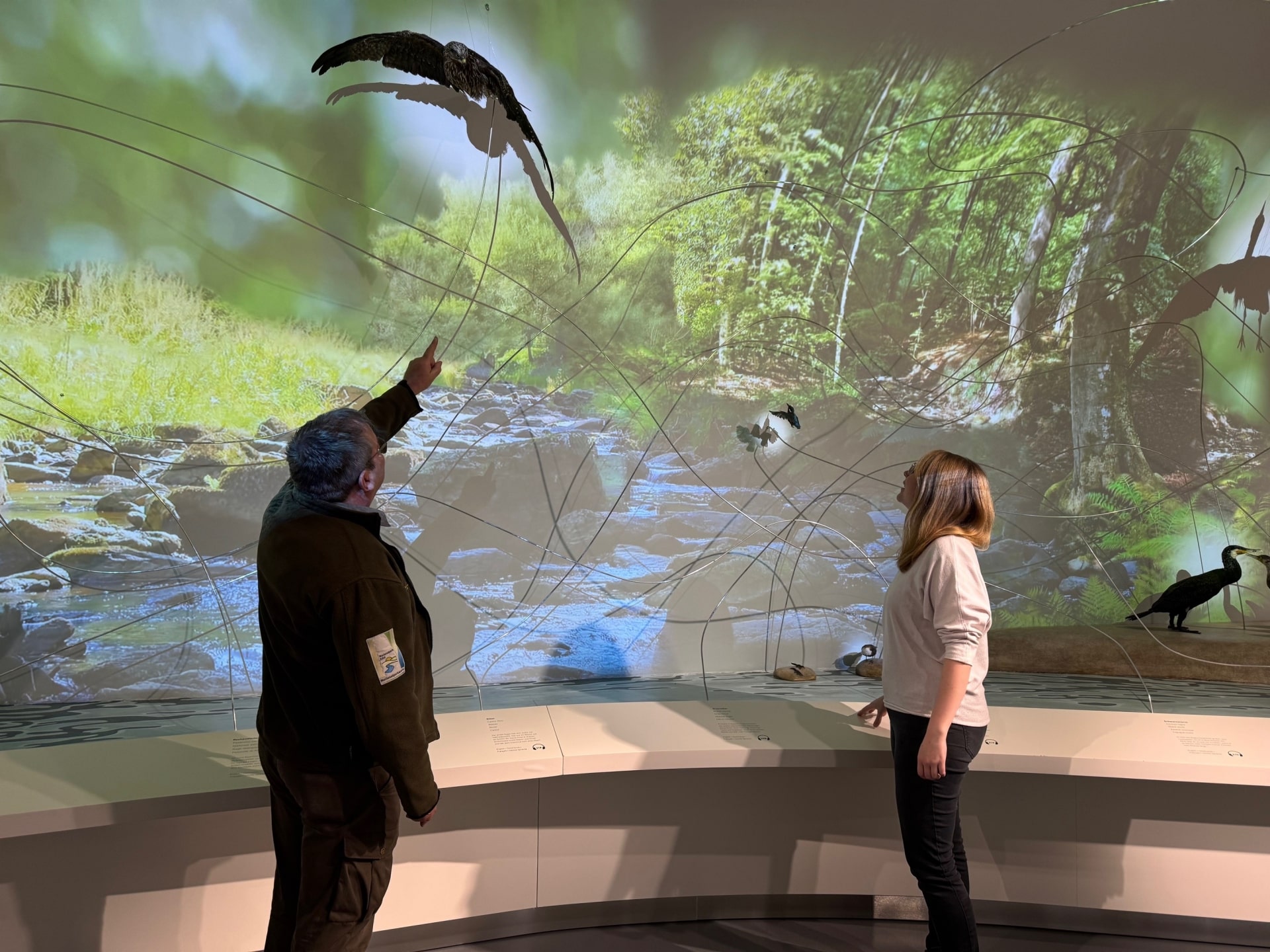 Bild 2 und 2a: Die Vogelwelt im Wasserraum der Erlebnisausstellung „Wildnis(t)räume“ hautnah erleben. Bild- und Filmprojektionen auf die Modelle rund um die Wasserwelt machen es möglich. (Nationalparkverwaltung Eifel/A. Simantke/M. Menninghaus)