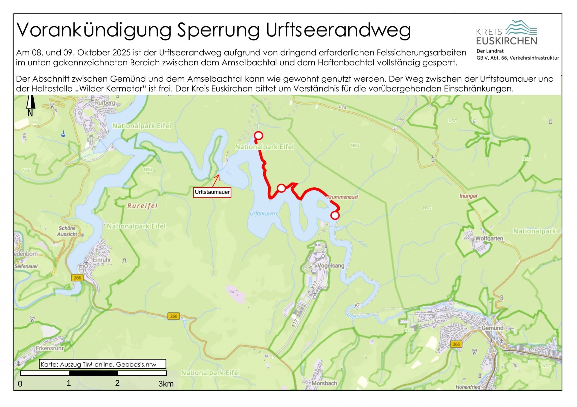 Der Kreis Euskirchen teilt mit, dass der Urftseerandweg im Nationalpark Eifel am 08. und 09. Oktober aufgrund von dringend erforderlichen Felssicherungsarbeiten zwischen dem Amselbachtal und dem Haftenbachtal vollständig gesperrt ist.