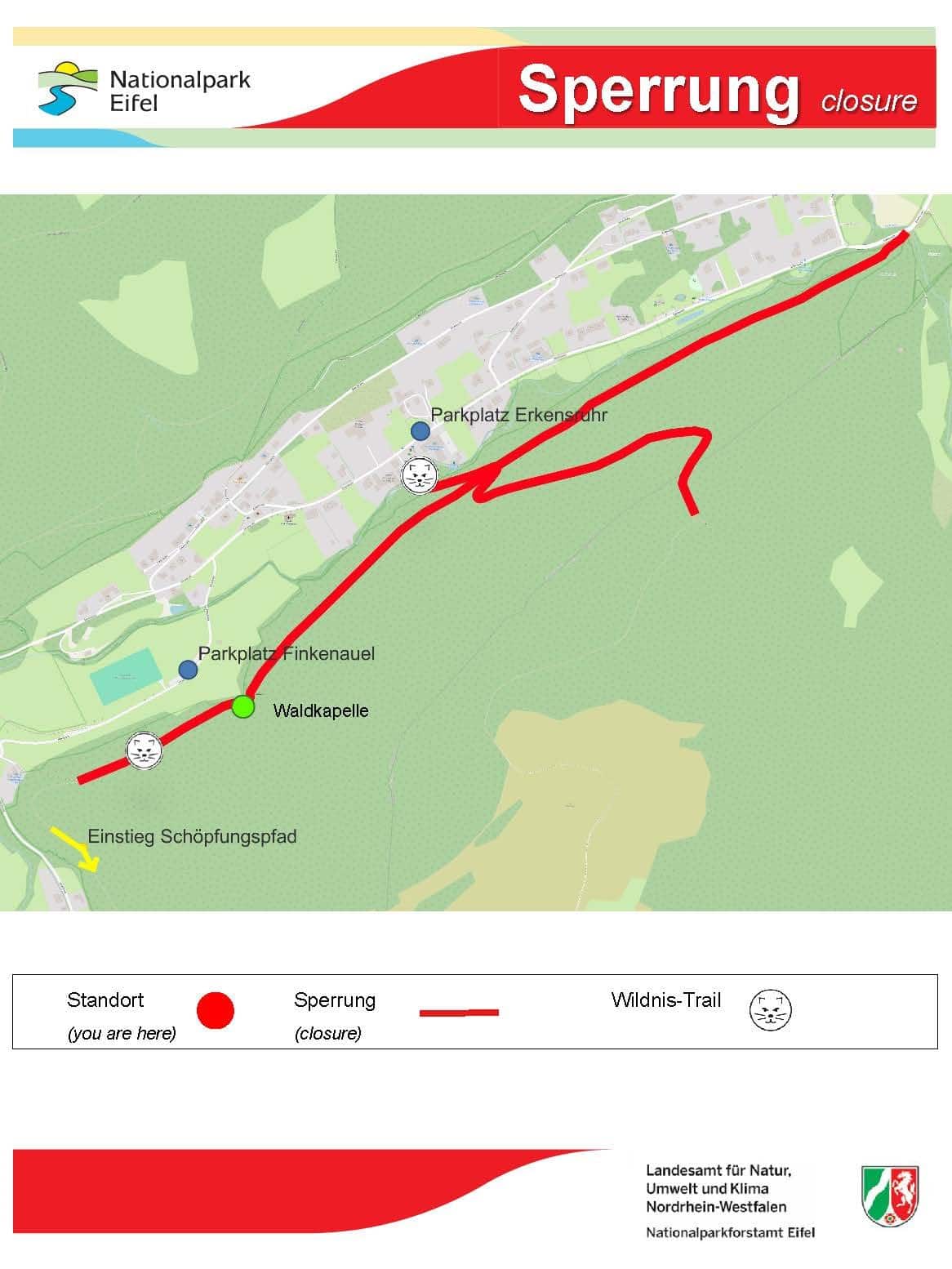 Aufgrund dringender Verkehrssicherungsmaßnahmen muss der Wegabschnitt oberhalb von Erkensruhr entlang der Waldkapelle bis zum 24. Oktober vollständig gesperrt werden. Die erste Etappe des Wildnis-Trails ist davon betroffen. Eine Umleitung ist nicht ausgewiesen. Wir empfehlen, die Straßen innerhalb von Hirschrott und Erkensruhr zu nutzen.