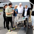 Bild 4: Tobias Wiesen, Querschnittsbeauftragter für Barrierefreiheit von der Nationalparkverwaltung Eifel(2. V. links) erläuterte nach der Zertifikatsübergabe der Urkunde „Reisen für Alle“ den Beteiligten die Einrichtungen zur Barrierefreiheit – hier im Außengelände auf dem Adlerhof in Vogelsang IP. (Foto: Nationalparkverwaltung Eifel/Annette Simantke)