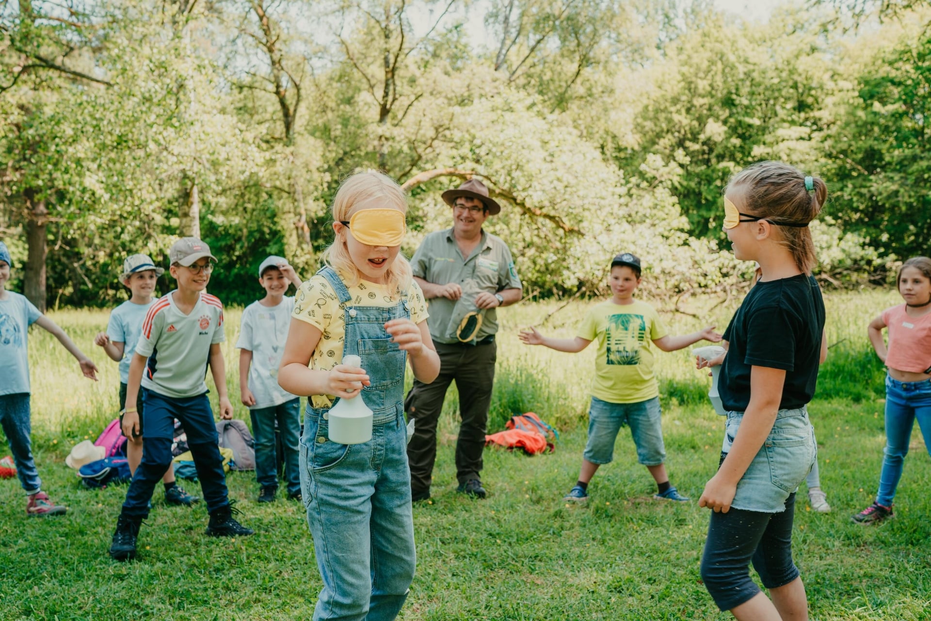 Bild: Mit den Sinnen einer Fledermaus auf Insektenjagd. Beim Fledermausspiel versuchen Kinder mit verbundenen Augen auf feinste Hörzeichen in ihrer Umgebung zu achten, um sich kein Nachtfalter – hier die umstehenden Kinder, - entgehen zu lassen. (A. Kleer)