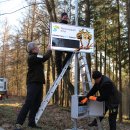 Bild 1: Die Mitarbeiter der Holzbauwerkstatt Harald Grieff (r.) und Clemens Scory (mi.) bauten heute gemeinsam mit dem stellvertretenden Nationalparkleiter Michael Lammertz (li.) zu Beginn der Motorradsaison das Lärmschutzdisplay im Kermeter wieder auf. Im vergangenen Jahr hatte es bereits zu einer erheblichen Reduzierung des Lärms durch Motorräder beigetragen. (Foto: Nationalparkverwaltung Eifel/A. Simantke)