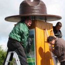 Bild 1 und 1a: Ein Blickfang ist die schöneRangerstele mit dem überdimensionierten Rangerhut, die als Treff- und Ausgangspunkt für die Rangertouren dient, hier am Kulturkino Vogelsang. (Foto:Nationalparkforstamt Eifel)