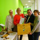 Bild 2: Auf dem „Markt der Möglichkeiten“ präsentierten die Nationalpark-Schulen ihre Projekte und erhielten durch NRW-Umweltminister Oliver Krischer und Projektleiterin Jutta D’Orsaneo (r.) von der Nationalparkverwaltung Eifel die Auszeichnung als Nationalpark-Schule - hier die Projektleiterinnen des Franziskus Gymnasiums Vossenack (l.). (Foto: Nationalparkverwaltung Eifel/ M. Menninghaus)