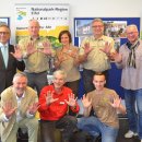 Bild 1: Noch lässt sich das Alter von Gästehaus und Wildniswerkstatt an zwei Händen abzählen: Heimbachs Bürgermeister Peter Cremer (obere Reihe von links nach rechts), Nationalparkleiter Dr. Michael Röös, die Leiterin des Fachgebiets Umweltbildung Jutta D’Orsaneo, der Leiter des Fachgebiets Kommunikation und Naturerleben Michael Lammertz, Friedberg Poth, der Geschäftsführer des Rureifel Tourismus e.V. Gotthard Kirch (untere Reihe von links nach rechts), Waldführer Herbert Greif und Junior-Ranger Jonas Heimbach blicken auf zehn Jahre erfolgreiche Kooperation zurück. (Foto: Victor Braden)