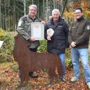 Bild 2: Zur Auszeichnung des barrierefreien Naturerkundungspfades "Der Wilde Weg" als UN-Dekade Projekt Biologische Vielfalt reiste Professor Karl-Heinz Erdmann (mitte) vom Bundesamt für Naturschutz in den Nationalpark Eifel und würdigte heute das Projekt mit der Überreichung der offiziellen Urkunde und der Auszeichnungstrophäe „Vielfalt-Baum“ an Michael Lammertz (links) und Tobias Wiesen (rechts) von der Nationalparkverwaltung Eifel. (Foto: Nationalparkverwaltung Eifel)