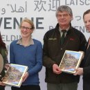 Foto 2: Rangerin Sara Karpinski (l.) besuchte zusammen mit US-Generalkonsul Michael Keller (ganz rechts) das Nationalpark-Zentrum Eifel. Maike Schlüter (zweite v. l.) und Dr. Hans-Joachim Spors von der Nationalparkverwaltung (zweiter v. r.) freuten sich über den Austausch. (Foto: Nationalparkverwaltung Eifel/A. Simantke)