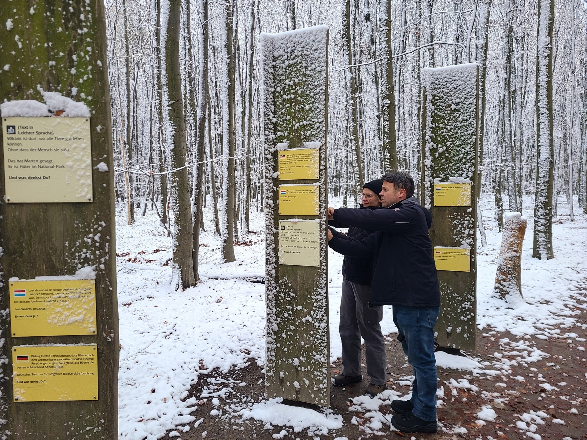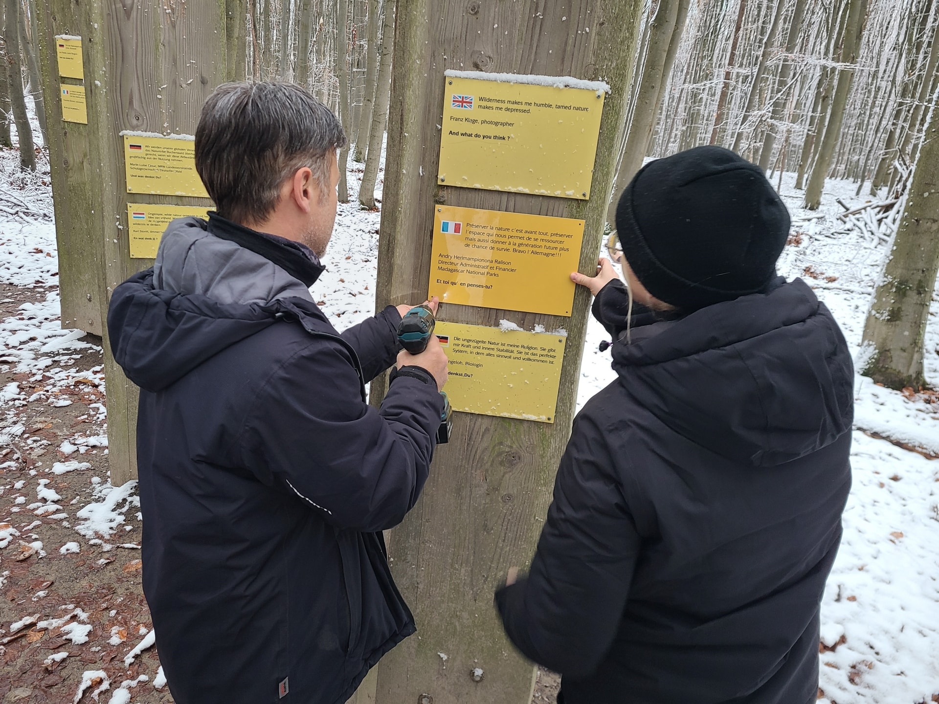Bild 1: Die Station „Perspektivwechsel“ am Ende des barrierefreien Naturerkundungspfades „Der Wilde Weg“ im Nationalpark Eifel erhält ein neues Zitat. Markus Wöbel und Christina Dubinjanski aus der Holzbauwerkstatt der Nationalparkverwaltung Eifel bringen die Tafel mit dem Zitat des Verwaltungschefs der Schutzgebiete des südostafrikanischen Inselstaates Madagaskar an. (Nationalparkverwaltung Eifel/A. Simantke)